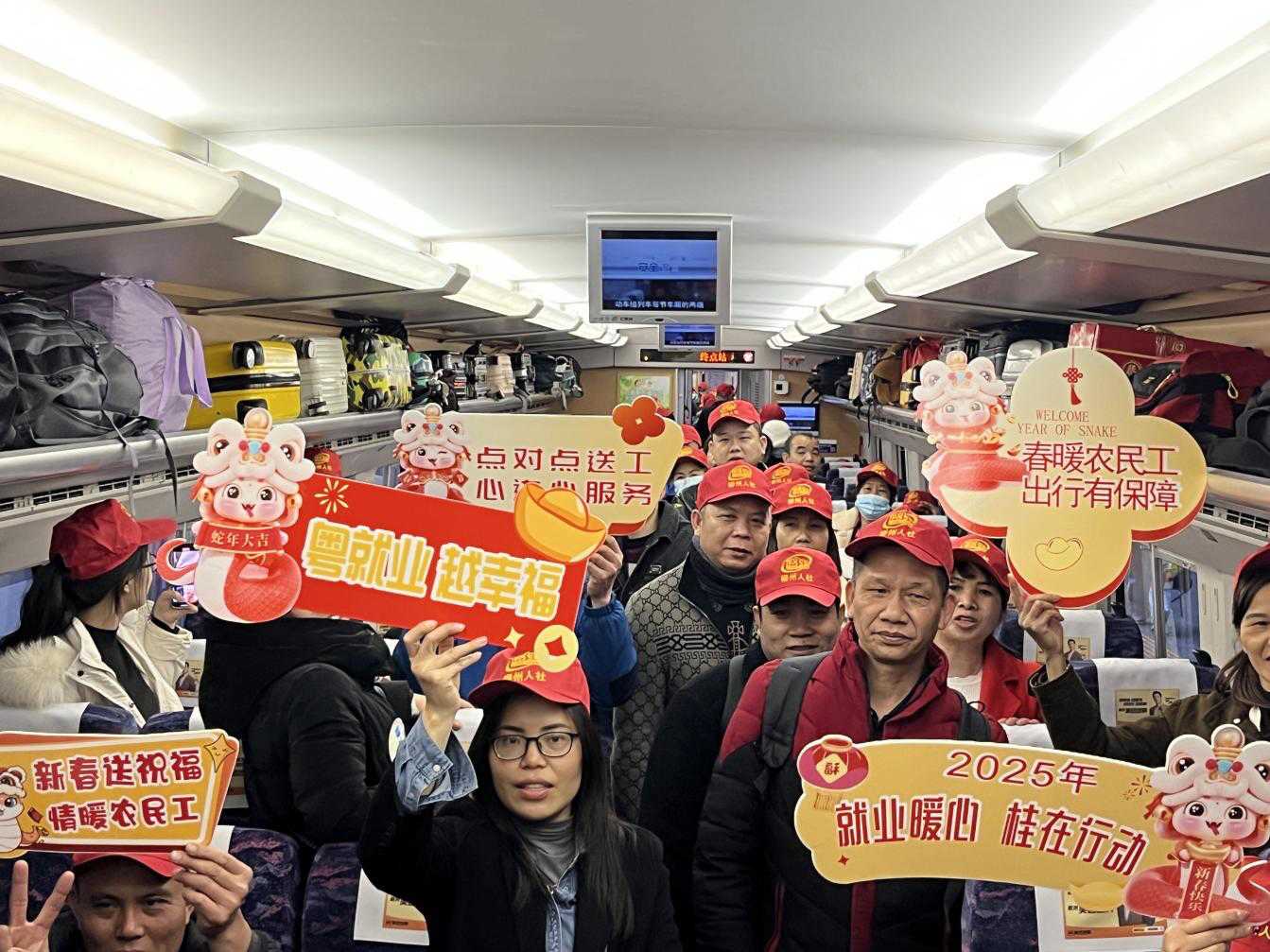 专列到达广州南站后,将有提前安排好的专车把务工人员送往深圳、东莞、佛山、中山等14个城市的近400家优质企业,全程为务工人员提供安全、便捷的出行服务。
