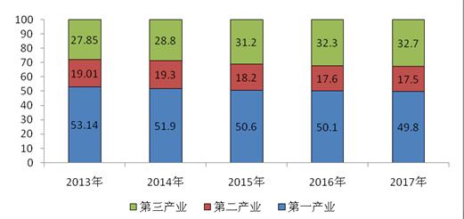 图1 近五年全自治区就业人员产业构成情况 单位:%