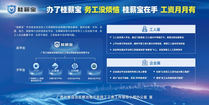 “桂薪宝指数”,量化评估。“桂薪宝指数”评价体系聚焦农民工实名制管理、工资专用账户管理、工资保证金等工资支付保障制度,紧盯劳动合同签订、人工费用拨付、工资发放等关键环节,能够全方位、全流程监管农民工工资支付情况,通过量化分析农民工工资支付数据,客观评估各地区、各施工企业的工资支付情况,为监管部门提供了直观的根治欠薪工作成效依据,推动拖欠农民工工资问题逐步得到有效治理。