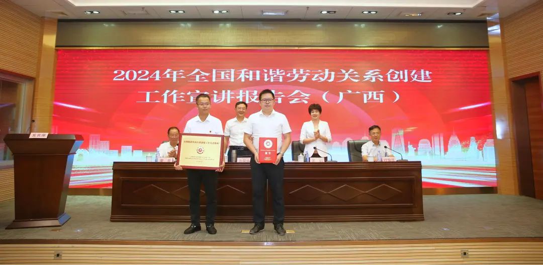 会上,自治区相关部门领导为广西受表彰的全国和谐劳动关系创建工作先进集体和先进个人颁发牌匾、证书、奖章。自治区人力资源社会保障厅劳动关系处、防城港市港口区沙潭江街道办事处荣获第一届全国和谐劳动关系创建工作先进集体,柳州市总工会韦红革等8人荣获第一届全国和谐劳动关系创建工作先进个人,6名先进个人代表作事迹宣讲。