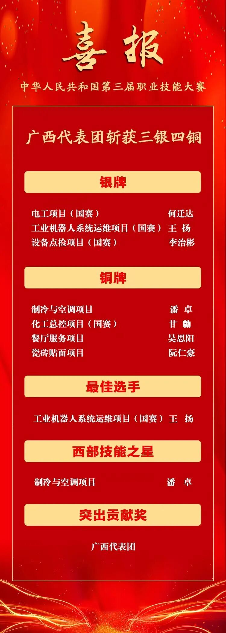 9月23日,为期5天的第三届全国技能大赛在郑州落幕,广西代表团斩获3银4铜,1名选手获“西部技能之星”,1名选手获“最佳选手奖”,32个竞赛项目排名进入全国前十,47个竞赛项目获优胜奖,广西代表团获“突出贡献奖”,创下广西参加全国技能大赛的历史最佳成绩。