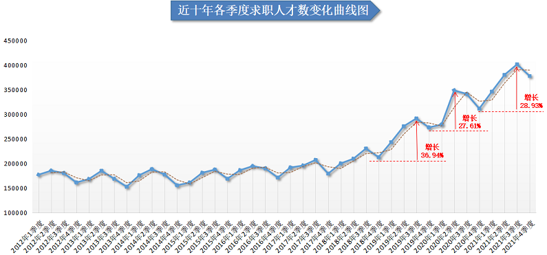 从人才供应量走势看,近年来广西人才网中人才供应量呈增长态势,近三年增长明显。2021年求职人才数为722220人,与上年度相比增加116135人,增幅为19.16%,其中2021年第三季度的求职人才数再创新高,达到近十年季度求职人才数的最高值,为401422人,与2020年第四季度相比大幅增长28.93%。