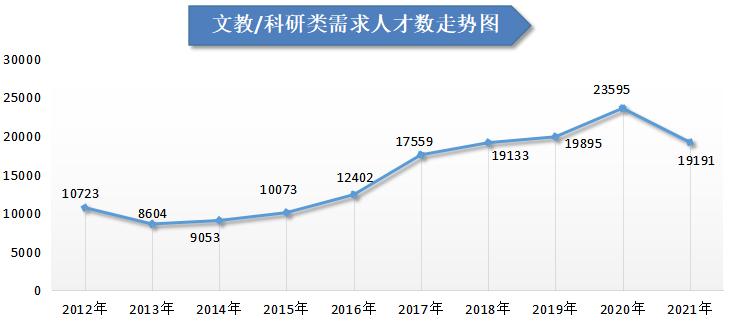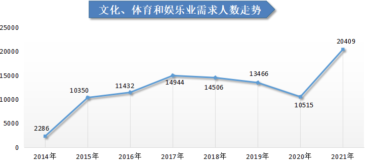另外,以文化/体育和娱乐业为首的8个行业在本年度实现增长,其中,文化/体育和娱乐业需求人才数为20409人,与上年度相比大幅增长94.09%,增长量为9894人,是本年度人才需求量增长最多的行业类型。