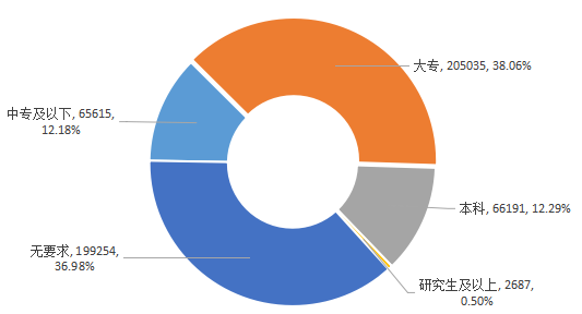 在需求方面,用人单位对求职人才的工作经验要求主要集中在1年以下,需求人才数为421398人,占比达到78.21%;另外,工作经验要求在1-5年的需求人才数为113350人,占比为21.04%;工作经验要求在6-10年的需求人才数为3134人,占比为0.58%;工作经验要求在10年以上的需求人才数为900人,占比为0.17%。