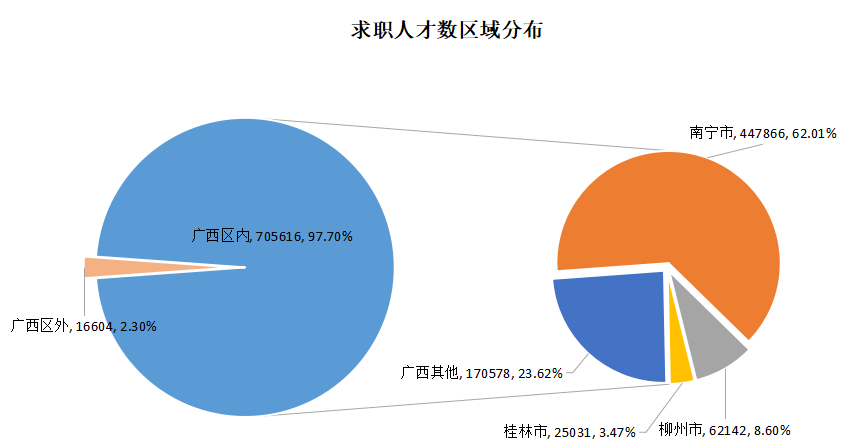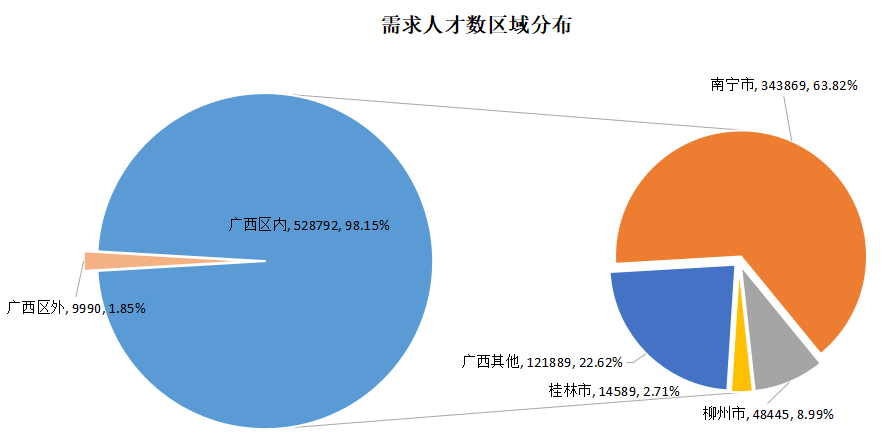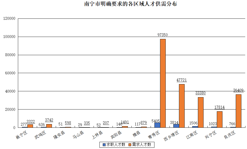 其中期望在南宁市工作的求职人才数达到447866人,占比62.01%,而工作地在南宁市的需求人才数为343869人,占比63.82%。对南宁市具体工作区域没有明确要求的求职人才有434044人,占比60.10%,而有明确要求的区域中,南宁市青秀区和西乡塘区是比较热门的求职地点,求职人才数分别有5405人和3814人,明确工作地在这两个区的用人单位需求人才数分别达到97350人和47721人。