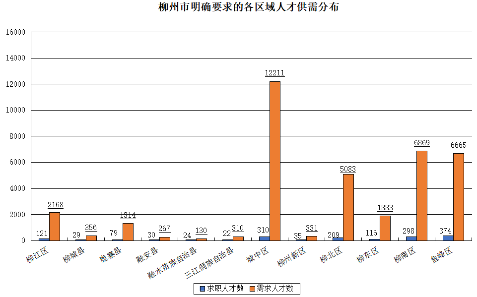 期望在柳州市工作的求职人才数为62142人,占比8.60%,工作地在柳州市的需求人才数为48445人,占比8.99%。对柳州市具体工作区域没有明确要求的求职人才有60495人,占比8.38%,而有明确要求的区域中,柳州市鱼峰区、城中区以及柳南区求职人才数较多,分别为374人、310人和298人,明确工作地用人单位需求人才数也集中在这三个区域,需求人才数分别为6665人、12211人以及6869人。