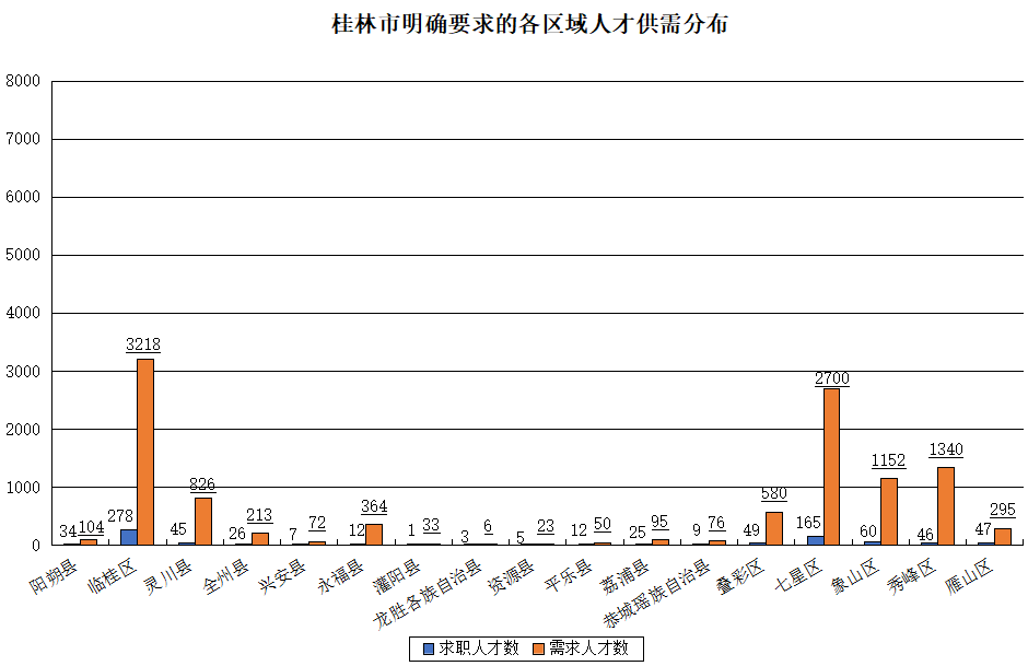 期望在桂林市工作的求职人才数为25031人,占比3.47%,工作地在桂林市的需求人才数为14589人,占比2.71%。对桂林市具体工作区域没有明确要求的求职人才有24207人,占比3.35%,而有明确要求的区域中,桂林市临桂区和七星区求职人才数相对较多,分别为278人和165人,明确工作地在这两个区的用人单位需求人才数分别为3218人和2700人。