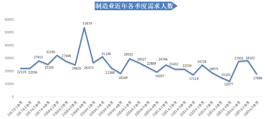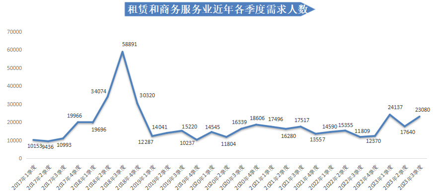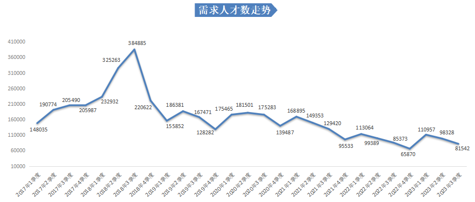 在人才需求方面,2023年第三季度人才需求量持续下滑,有招聘需求的用人单位需求人才数为81542人,同比下滑4.49%,环比下滑17.07%。