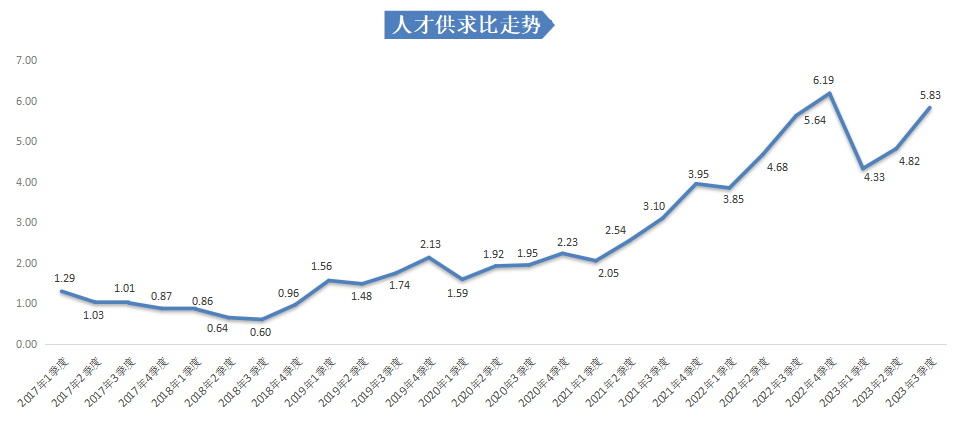 2023年第三季度,人才供求比为5.83,与上年同期相比增加0.19,仍存在一定的竞争压力,超过5个人竞争1个岗位。