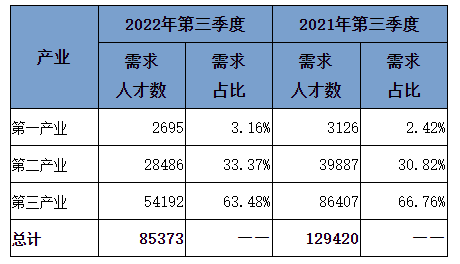近两年第三季度具体产业人才需求分布见下表: