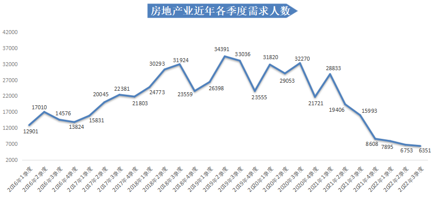 2022年第三季度,房地产业人才需求量持续低迷,需求人才数为6351人,与上年同期的15993人相比减少9642人,同比大幅下滑60.29%。房地产业人才需求的大幅下跌主要受房地产中介服务、房地产开发经营等行业的影响,这两个行业的需求人才数分别为904人和2791人,与上年同期相比减少了3574人和3300人,降幅分别为79.81%和54.18%。