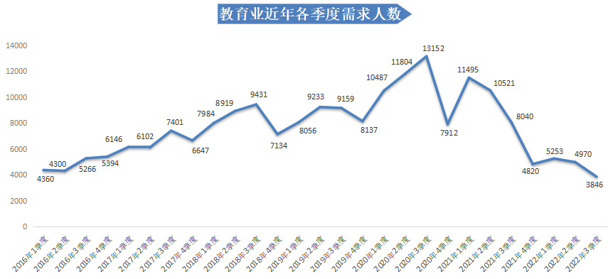 2022年第三季度,广西人才网中教育业人才需求下降趋势明显,需求人才数为3846人,与上年同期的8040人相比减少4194人,同比下滑52.16%,环比下滑22.62%。