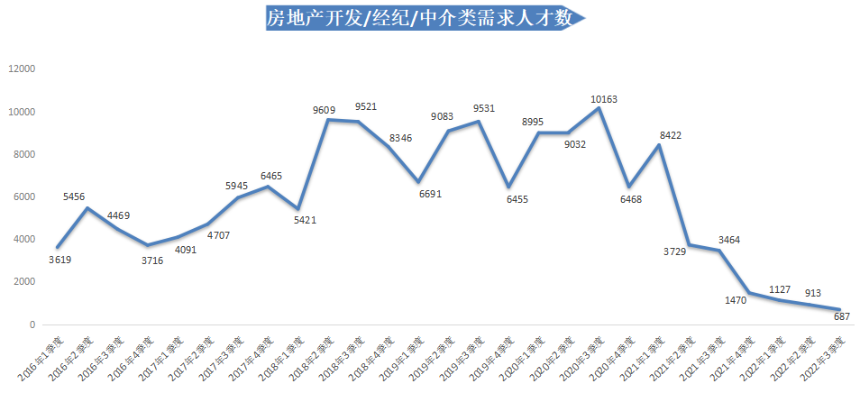 2022年第三季度,广西人才网中房地产开发/经纪/中介类职位需求人才数为687人,与上年同期的3464人相比减少2777人,同比下滑80.17%,环比下滑24.75%。其中,房地产销售/置业顾问人才需求的大幅减少是导致房地产开发/经纪/中介类职位需求人才数大幅下滑的主要原因,其需求人才数为428人,比上年同期减少2062人,同比降幅达82.81%,环比降幅为37.06%。
