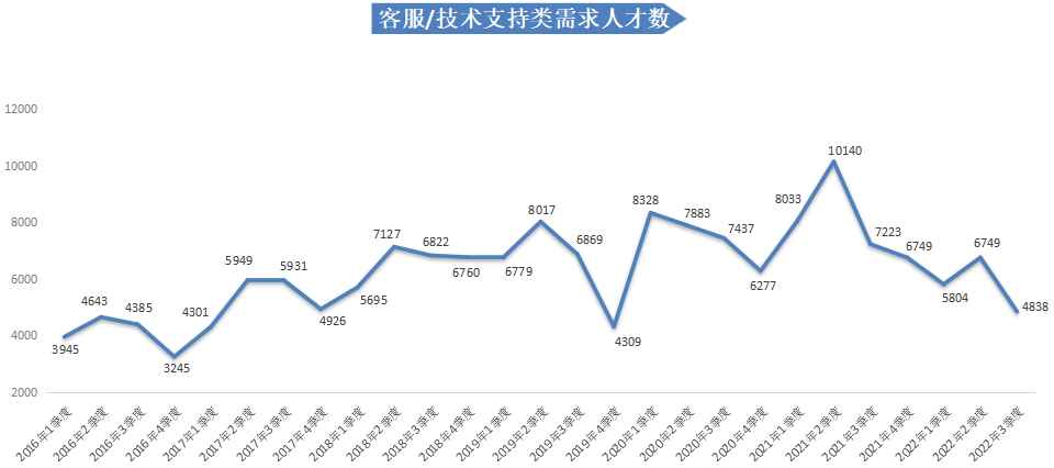 2022年第三季度,广西人才网中客服/技术支持类职位的需求人才数为4838人,比上年同期的7223人减少2385人,同比下滑33.02%。在该类职位类型中,人才需求减少量较大的有客服专员/助理(非技术)职位,需求人才数为2590人,比上年同期减少2626人,降幅为50.35%。