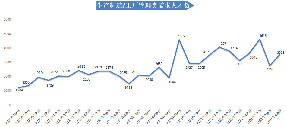 另外,本季度有8个职位类别实现增长,其中增长较大的职位类别是生产制造/工厂管理类,需求人才数为3539人,比上年同期增加423人,同比增长13.58%。