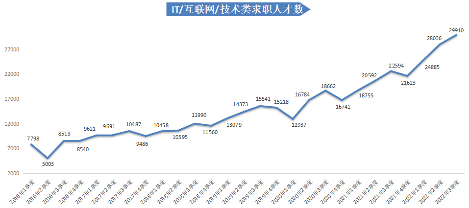 2022年第三季度,广西人才网中IT/互联网/技术类(包含计算机硬件开发类、计算机软件开发类、IT管理/项目协调类等七类职位类别,具体见附表3,下同)职位的人才供应量呈持续增长态势,求职人才数达到29910人,与上年同期的22594人相比增加7316人,同比大幅增长32.38%。其中,互联网产品/运营管理/电子商务类、计算机软件开发类、计算机硬件开发类等职位的求职人才数增长较多,分别增加2240人、1523人和1206人,涨幅分别为35.33%、35.78%和57.46%。