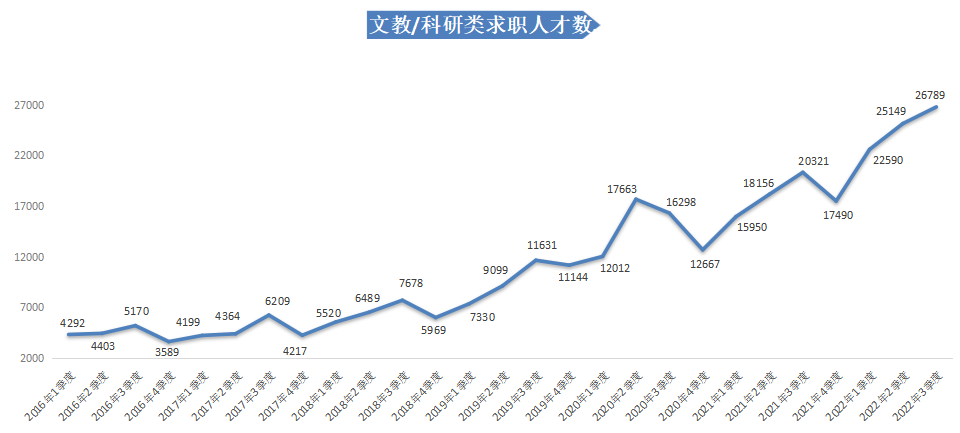 2022年第三季度,广西人才网中文教/科研类职位的人才供应量呈明显增长态势,其求职人才数为26789人,与上年同期的20321人相比增加6468人,同比增长31.83%。