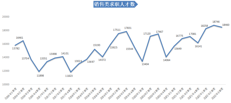 2022年第三季度,广西人才网中销售类职位的求职人才数与上季度相比略有下降,但仍处于较高水平,为18460人,与上年同期的17081人相比增加1379人,同比增长8.07%。