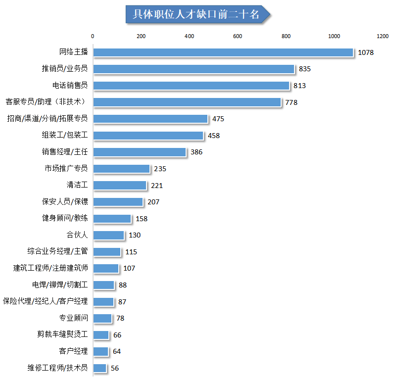 而在具体职位中,部分职位仍存在一定的人才缺口,从用人单位最急需人才的前二十名具体职位排名可看到,业务类人才较为紧缺,超过五成的职位与业务挂钩,其中网络主播、推销员/业务员、电话销售员等职位人才缺口排名前三,这三个职位的人才缺口分别达到1078人、835人及813人。