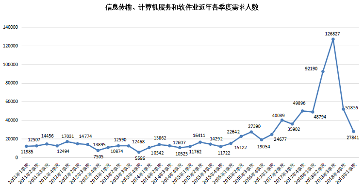 2019年第一季度,广西人才网联系统中信息传输、计算机服务和软件业的人才需求下滑明显,其人才需求量为27841人,比上年同期的48794人减少20953人,大幅下滑42.94%,环比降幅达到46.31%。其中,互联网和电子商务行业的人才需求分别为12823人和6221人,比上年同期分别减少12485人和6829人,同比降幅分别达到49.33%和52.33%。