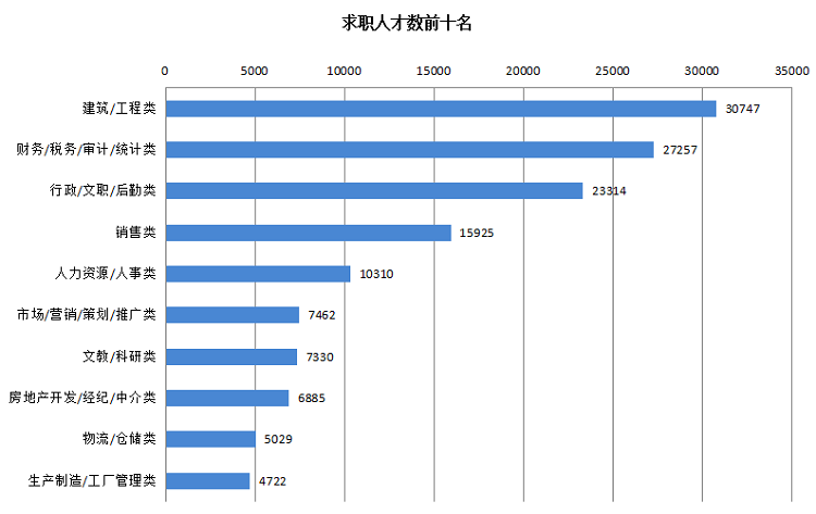 2.建筑/工程类职位的求职人才数位居榜首,为30747人,与去年同期相比仍增加5580人,同比涨幅为22.17%,该职位的求职增长量位居第一。