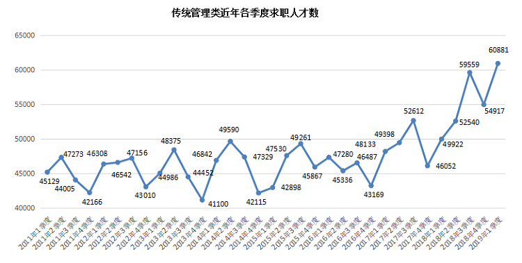 3.三大传统管理类职位的人才供应总量创新高,其求职人才数达到60881人,与上年同期相比增长10959人,同比大幅增长21.95%。