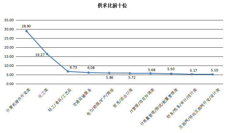 其中,计算机硬件开发类、化工类及轻工/食品/工艺品职位就业竞争压力较大,其供求比分别高达28.90、16.27及6.73,位居供求比前三位;而服务业三类职位和销售类等职位由于人员流动性大等特征,需求长期旺盛,供求比长期位居供求比后十位,其合计供求比分别仅为0.68和0.44。