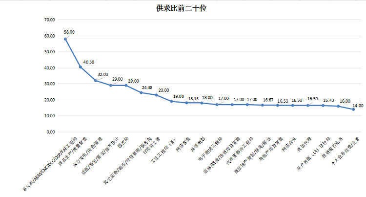 1. 总体供求比为1.56,与上年同期相比增加0.70,其中54个主要职位类型中,人才供求比大于2的职位类型高达35个,其中20个类型的职位竞争激烈,人才供求比大于3。