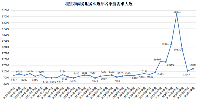 3.租赁和商务服务行业人才需求大幅下跌,需求人才数跌至14041人,与上年同期的34074人相比降幅达到58.79%。