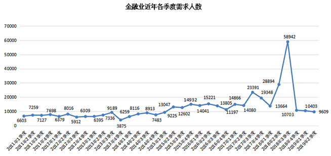 4.金融业人才需求持续下滑,自2015年第二季度以来首次跌破万人,其需求人才数仅为9609人,环比下降7.63%,同比降幅达到66.74%。其下降的主要原因是银行、证券和保险业之外的其他金融行业出现大幅下滑,例如信贷等其他金融服务行业的人才需求大幅萎缩。