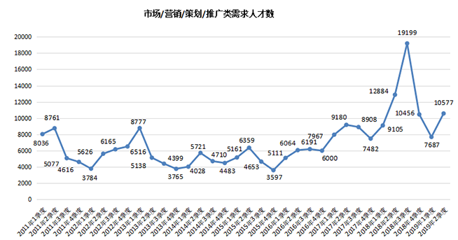 2.市场/营销/策划/推广类职位人才需求有一定回升,但与去年同期相比仍有较大差距,其需求人才数达到10577人,环比涨幅为37.60%,但与上年同期的12884人相比仍减少2307人,同比下降17.91%。