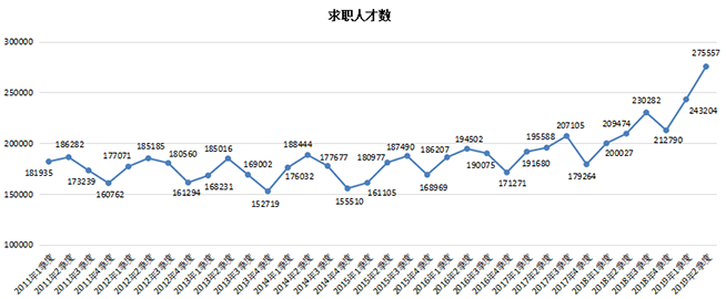 2019年第二季度,广西人才网联系统的求职人才数创历史新高,达到275557人,同比涨幅为31.55%,54个主要职位类型的求职人才数均实现不同程度的增长。