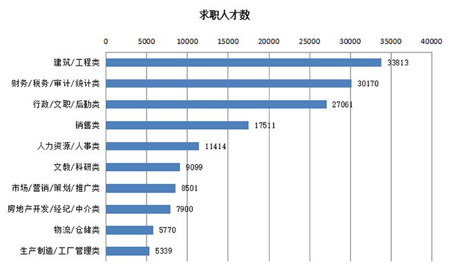 1.建筑/工程类职位最受求职者青睐,其求职人才数再创历史新高,达到33813人,与去年同期的25436人相比增加8377人,同比大幅增长32.93%。