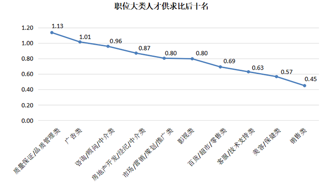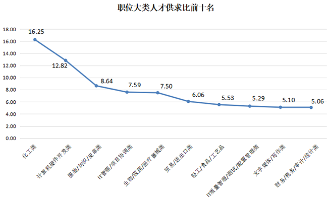 54个主要职位类型中,人才供求比大于2的职位类型高达37个,其中22个类型的职位竞争激烈,人才供求比大于3。其中化工类、计算机硬件开发类及服装/纺织/皮革类职位需求极少,就业竞争压力大,其供求比分别高达16.25、12.82及8.64。