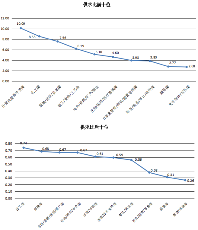 其中,由于需求极少,计算机硬件开发类、化工类及服装/纺织/皮革类等职位就业竞争压力较大,其供求比分别高达10.09、8.53及7.56,位居供求比前三位;而服务业三类职位和销售类等职位由于人员流动性大等特征,需求长期旺盛,供求比长期位居供求比后十位,其合计供求比分别仅为0.42和0.31。