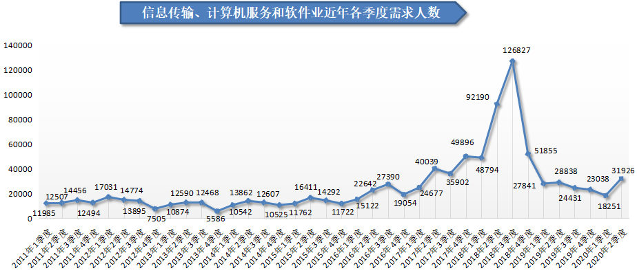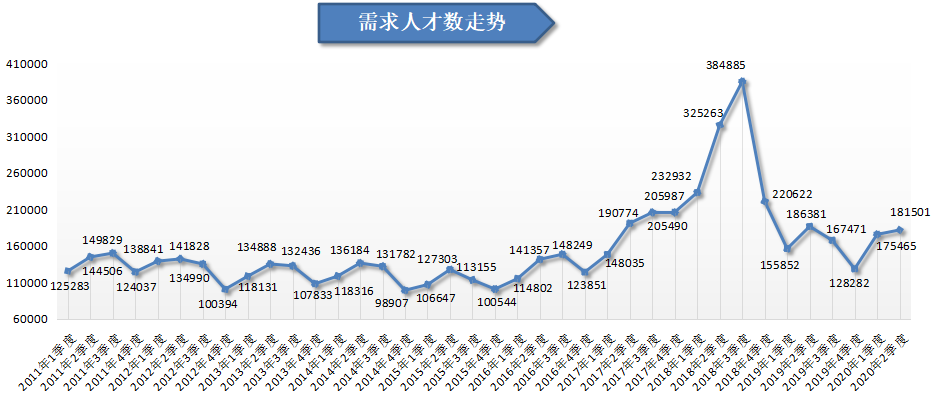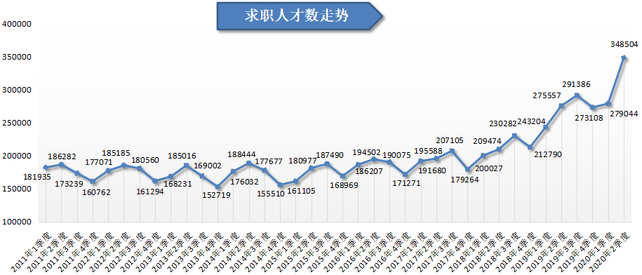 在人才供给方面,求职人才数创历史新高,在2020年第二季度达到348504人,比上年同期增加72947人,同比增长26.47%。
