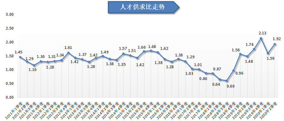2020年第二季度,广西人才网人才供求比为1.92(即人才需求人数或职位数为1时,人才供给或求职人才数为1.92,下同),比上年同期的1.48增加0.44,就业压力有所增大。