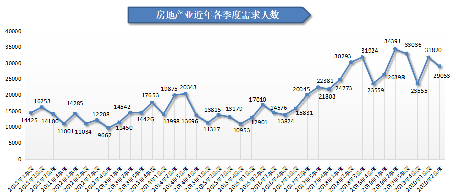 1.房地产业的人才需求在本季度出现回落,其需求人才数为29053人,比上年同期的34391人减少5338人,同比大幅下降15.52%,环比下降8.70%。其中,房地产开发经营行业人才需求下降较大,其需求人才数为10305人,比上年同期的14335人减少4030人,同比大幅下降28.11%。