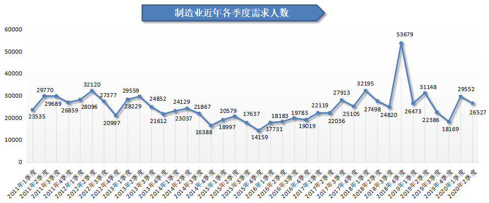 2.制造业需求人才数为26527人,与上年同期相比减少了4621人,同比下降14.84%。其中人才需求同比减少较大的行业主要是快速消费品行业,其需求人才数为8530人,比上年同期减少5740人,同比降幅为40.22%。
