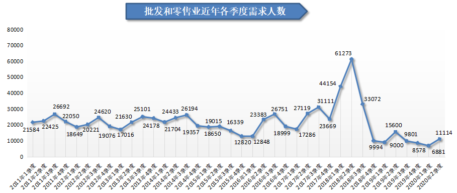 3.批发和零售业需求人才数为11114人,与上年同期的15600人相比减少了4486人,同比大幅下降28.76%,其中批发/零售业人才需求的减少是导致该行业人才需求同比大幅下降的主要原因,其需求人才数为8900人,比上年同期减少4164人,同比大幅下降31.87%。
