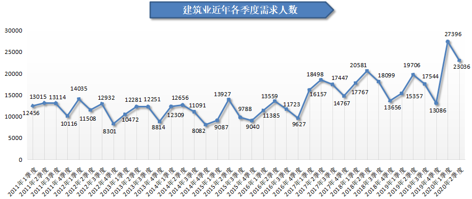 5.建筑业的需求人才数同比增长明显,为23036人,比上年同期的19706人增加3330人,同比增长16.90%,是本季度人才需求同比增长量最大的行业。其中房屋和土木工程建筑行业是建筑业人才需求的主要增长点,其需求人才数为12709人,比上年同期增加4424人,同比涨幅为34.81%。