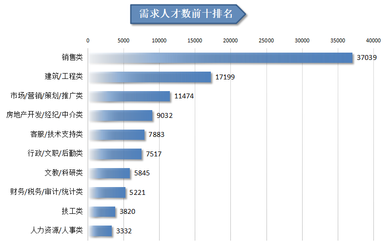 位居需求榜前十名的职位:销售类、建筑/工程类、市场/营销/策划/推广类、房地产开发/经纪/中介类、客服/技术支持类、行政/文职/后勤类、文教/科研类、财务/税务/审计/统计类、技工类、人力资源/人事类等职位类型。这十个职位类型的需求人才数总计108362人,占人才总需求量的59.70%。
