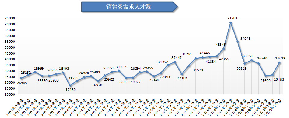 1.销售类职位需求人才数为37039人,与上年同期的38951人相比,虽小幅下降4.91%,但与上季度相比增加了10556人,环比大幅增长39.86%。
