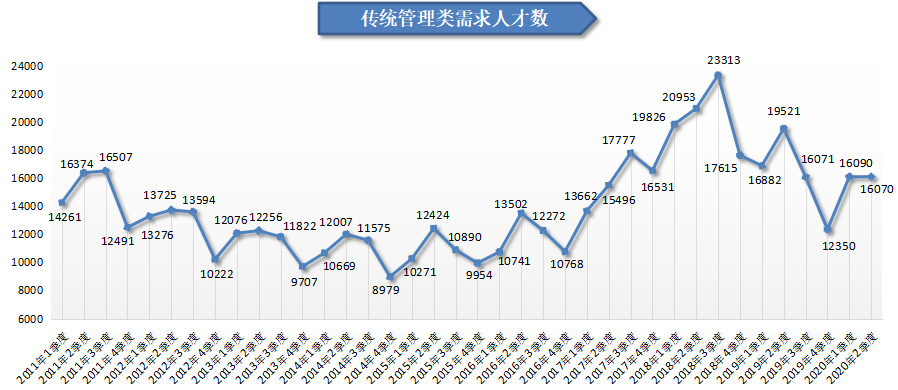 2.三大传统管理类职位(包含行政/文职/后勤类、人力资源/人事类及财务/税务/审计/统计类等职位类别,下同)的人才需求总量为16070人,与上年同期相比减少3451人,同比下滑17.68%。