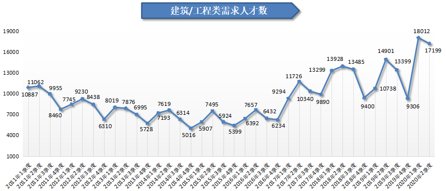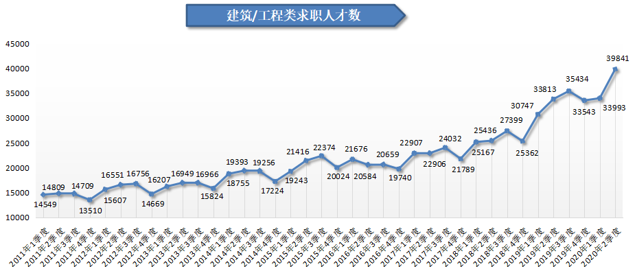 2020年第二季度,广西人才网中建筑/工程类职位的求职人才数为39841人,与去年同期的33813人相比增加6028人,同比增长17.83%。