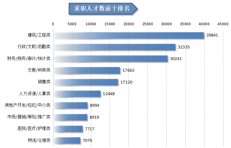 位居求职榜前十名的职位:建筑/工程类、行政/文职/后勤类、财务/税务/审计/统计类、文教/科研类、销售类、人力资源/人事类、房地产开发/经纪/中介类、市场/营销/策划/推广类、医院/医疗/护理类、物流/仓储类等职位类型。这十个职位类型的求职人才数量总计182357人,合计占比达到52.33%。其中,建筑/工程类、行政/文职/后勤类及财务/税务/审计/统计类这三类职位类型的求职人才数稳居前三位,均超过30000人。