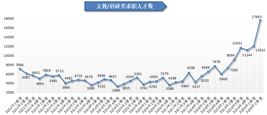 2020年第二季度,广西人才网中文教/科研类职位的人才供应量持续攀高,其求职人才数为17663人,比上年同期增加8564人,同比涨幅高达94.12%。