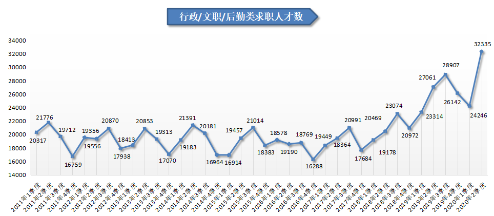 2020年第二季度,广西人才网中行政/文职/后勤类职位的求职人才数为32335人,比上年同期增加5274人,同比大幅增长19.49%。