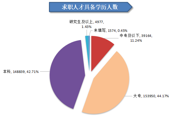 2020年第二季度,广西人才网求职人才学历长期集中在大专和本科学历,其中大专学历求职人才数占比高达44.17%,本科学历求职人才数占比达42.71%,大专和本科学历的求职人才共计302789人,与上年同期的237823人相比增加64966人,同比增长27.32%。