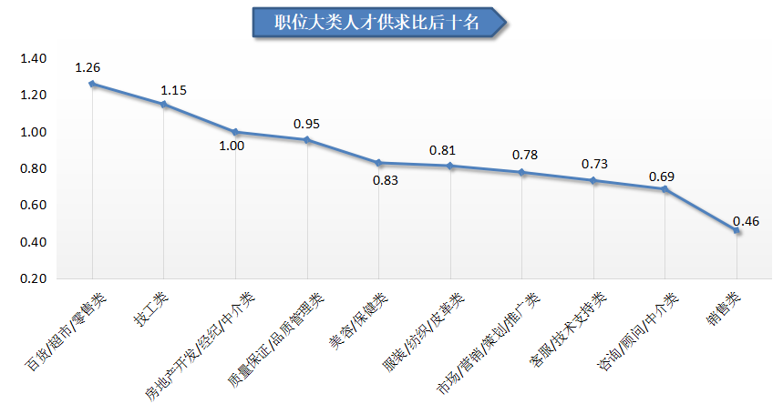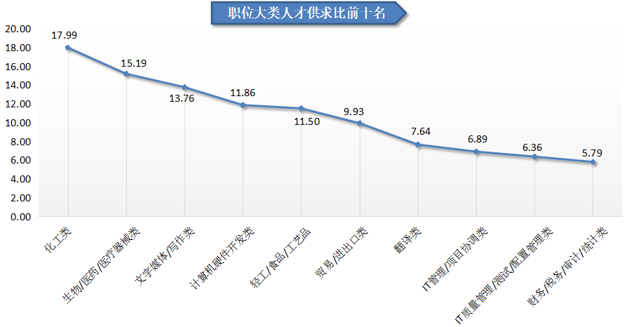 54个主要职位类型中,人才供求比大于2的职位类型有38个,其中26个类型的职位竞争激烈,人才供求比大于等于3。其中化工类、生物/医药/医疗器械类和文字媒体/写作类职位由于需求较少,就业竞争压力较大,其供求比分别达到17.99、15.19和13.76。